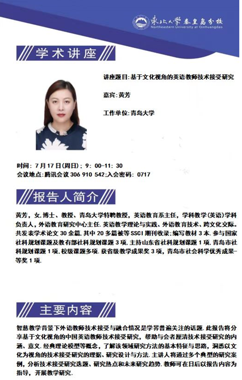 2022年7月17日上午,黄芳教授应邀为东北大学秦皇岛分校外国语言文化学院的师生做了题为《基于文化视角的英语教师技术接受研究》的学术讲座。此次讲座由惠良虹教授主持,以腾讯会议的方式进行,吸引了东北大学秦皇岛分校及其他院校的百余名师生参加。东北大学秦皇岛分校外国语言文化学院赵玉容院长及三上悠亚在线