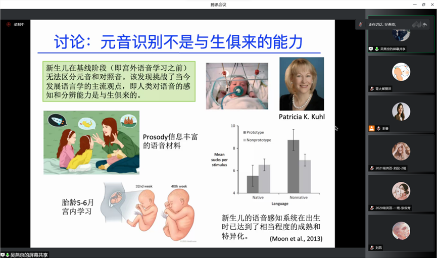 吴教授所报告的新生儿语言习得的认知神经机制分别作为封面文章和重点文章发表在Human Brain Mapping和Nature子刊(Nature Human Behavior)上,是一项跨心理语言学与认知神经学的科学研究。报告内容包括新生儿情绪语言加工、新生儿音素学习两方面的研究。吴教授通过科学问题——人类的情感源于何处,引出新生儿情绪语言加工的研究,并通过回顾以往情绪加工偏向研究,指出现有研究对象多为成人,新生儿情绪加工偏向鲜有涉及且结论偏差较大。因此,吴燕京博士利用MEG成像技术时间、空间分辨率相均衡且安全性较高的优势,研究了儿童在刚出生时表现为正性偏向还是负性偏向的问题。有趣的是,此研究得到的结论与前人截然相反,发现儿童在刚出生时表现为正性偏向,吴教授对此从进化心理学的角度巧妙的解释了这个结论。关于新生儿音素学习的研究,吴教授向我们梳理了以往研究的观点,即人类的语言感知系统在出生时已达到了相当程度的成熟,因此新生儿天生就能分辨绝大多数语言中的元音和辅音。但是,以往研究通常在新生儿出生后数天或者数周进行,新生儿已经接触过一段时间的语言,而且,新生儿在出生前也会接受一段时间的韵律学习,。吴教授在此基础上提出了更为严谨的研究问题:当天出生的新生儿能否分辨朴素音素(无韵律元音)?最后,研究发现新生儿在基线阶段(即言外语音学习之前)无法区分元音和对照音,该发现挑战了当今发展语言学的主流观点(即人类对语音的感知和分辨能力与生俱来)。而且,出生仅仅五个小时后的新生儿就可以学习辨别语音刺激,支持该能力可能是婴儿语言模仿功能的核心机制——感知运动环路(sensorimotor loop)的雏形。此研究结果得到了发展语言学泰斗,美国科学院、艺术与科学院双院院士Patricia K. Kuhl的高度评价,并作为Nature Human Behavior重点文章发表。最后在报告完成后,大家围绕相关问题进行了长时间的热烈讨论。