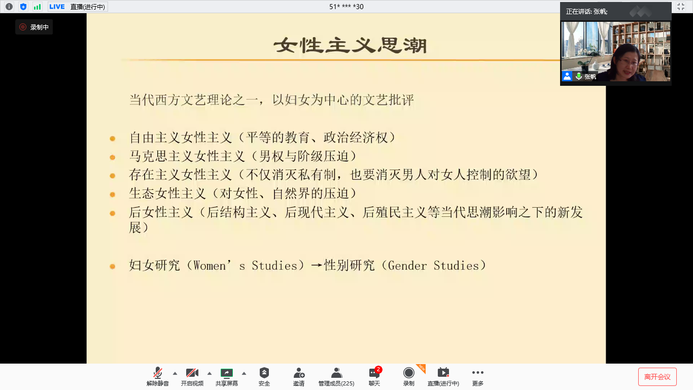 德语系94级校友、上海外国语大学博士生导师张帆教授通过腾讯会议为我们带来了“德语女性主义语言学导论”的学术讲座。本次讲座由德语系主任綦甲福教授主持,德语系师生、校友以及来自国内外高校的师生共230余名听众聆听了讲座。