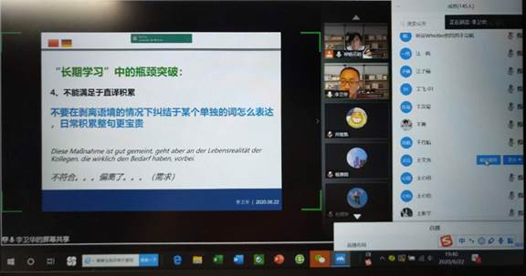 师生带来了题为“德语翻译实战能力提升:长期学习与短期提高”的精彩讲座。讲座由德语系刘沁卉老师主持,德语系师生、各届校友共260余人通过腾讯会议云平台参与了本次讲座。
