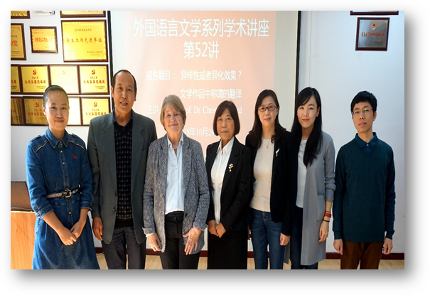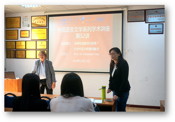 邀请,做客外国语言文学系列学术讲座第52讲,在博文楼312会议室作题为“异样性或者异化效果?——文学作品中称谓的翻译”的学术讲座。讲座由德语系刘沁卉老师主持,学院60余名师生聆听了讲座。
