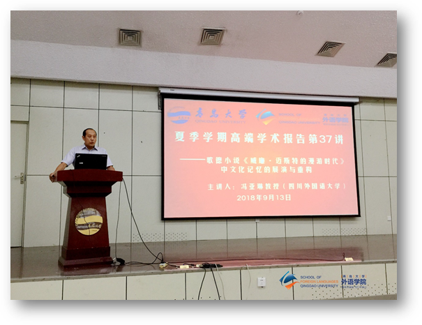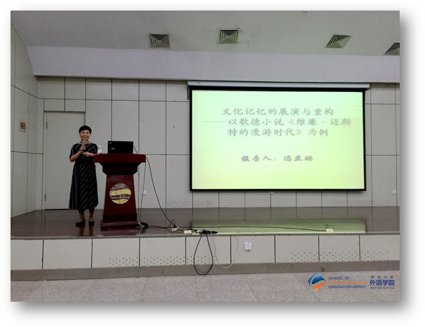 在图书馆报告厅举行夏季学期高端学术讲座第37讲。四川外国语大学中外文化比较研究中心主任、博士生导师、二级教授冯亚琳老师应邀作“歌德小说《威廉•迈斯特的漫游时代》中文化记忆的展演与重构”的高端学术讲座。德语系主任綦甲福教授主持,校内外师生200余人聆听了讲座。