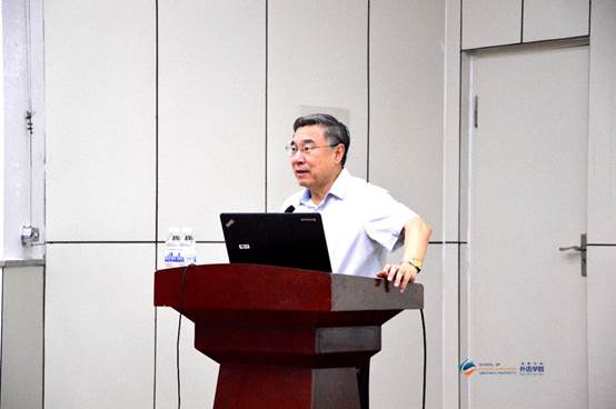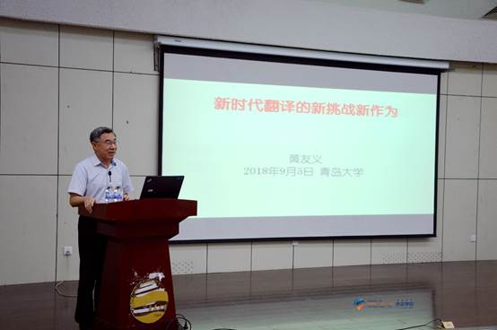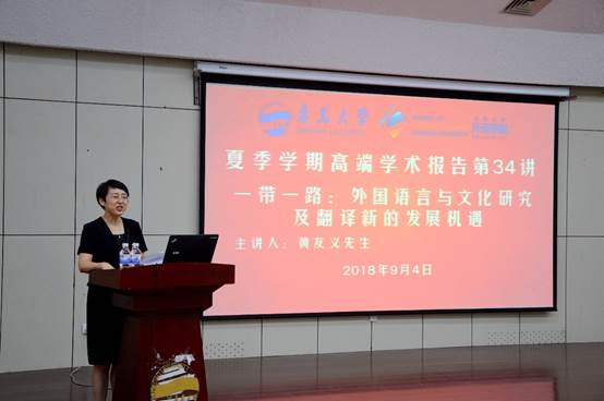 在图书馆报告厅举行夏季学期高端学术讲座第34讲。中国译协常务副会长、著名翻译专家黄友义先生应邀作“新时代翻译的新挑战新作为”的高端学术讲座。卞建华院长主持,全校师生270余人聆听了讲座。