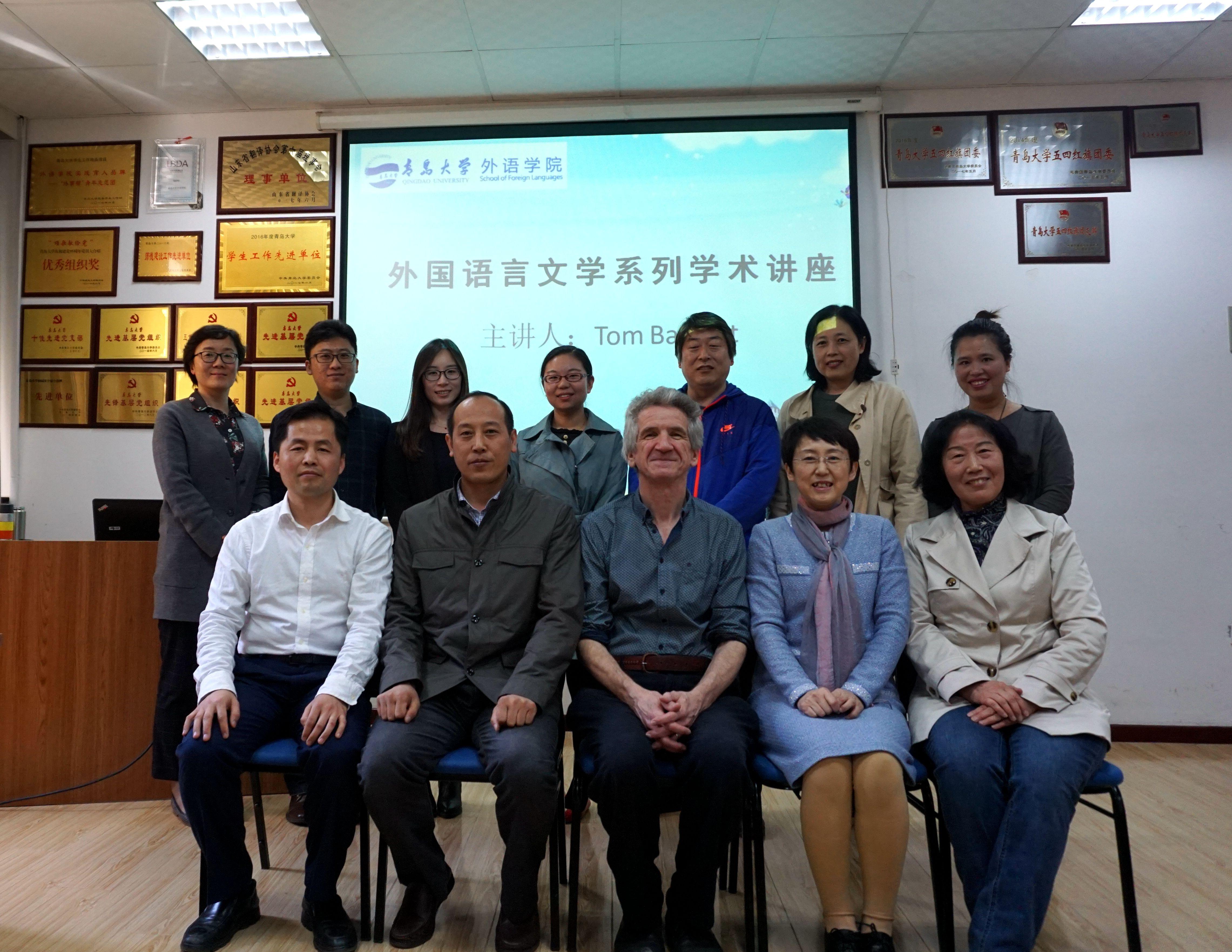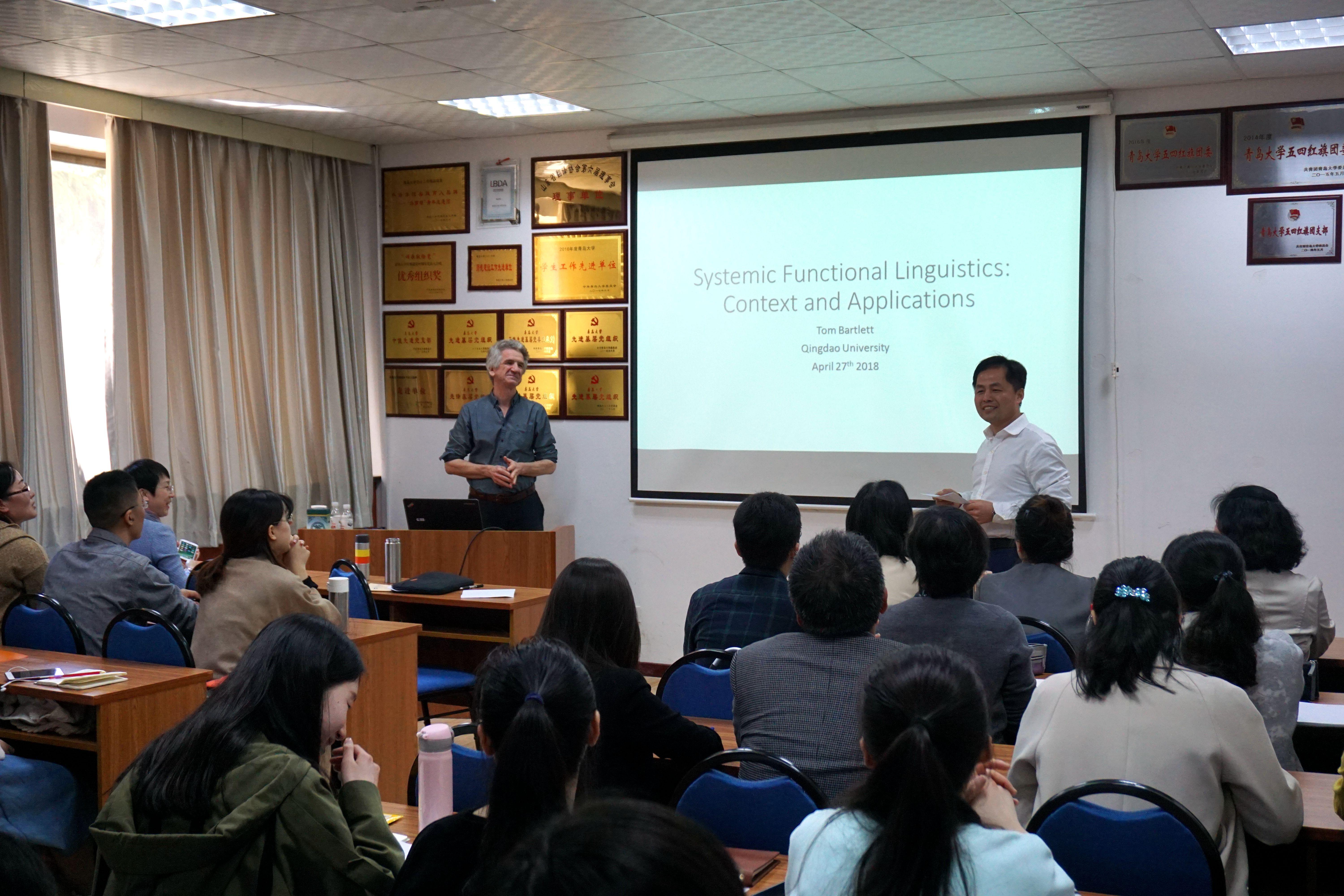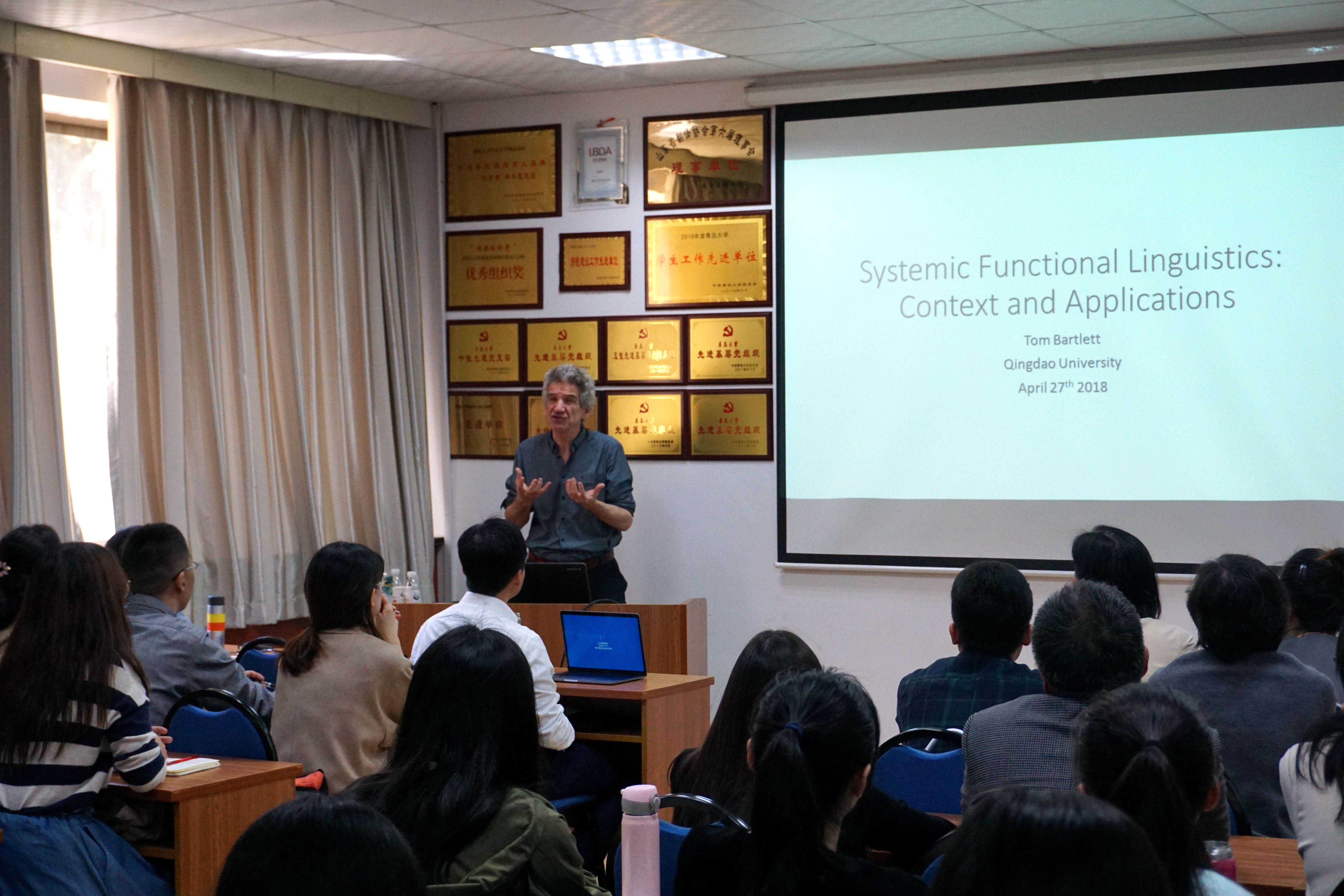 在博文楼312会议室举行外国语言文学系列学术讲座第38讲。英国卡迪夫大学Tom Bartlett博士应邀作“系统功能语言学:语境与应用”专题学术讲座。院长助理布占廷主持。院长卞建华、学院部分教师和研究生,以及来自中国海洋大学、青岛科技大学和三上悠亚在线