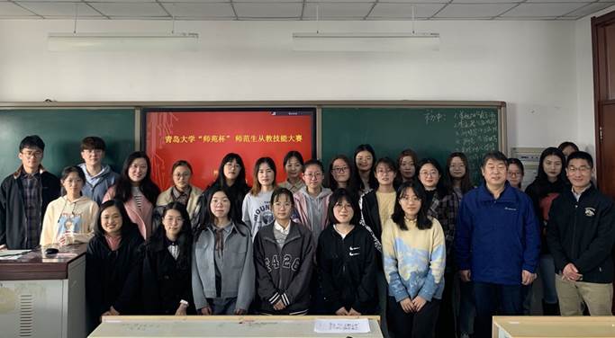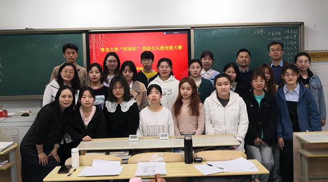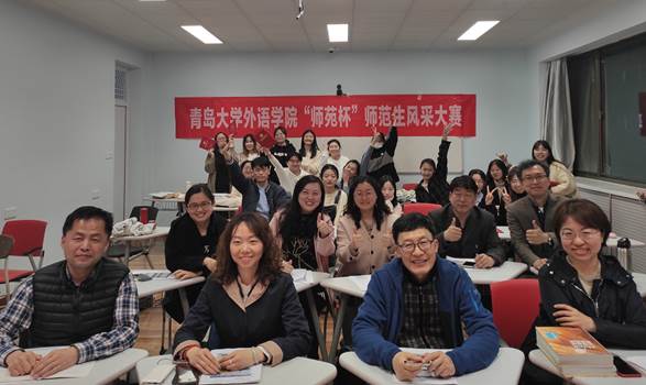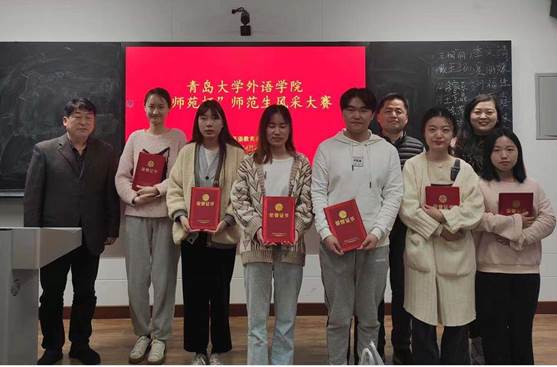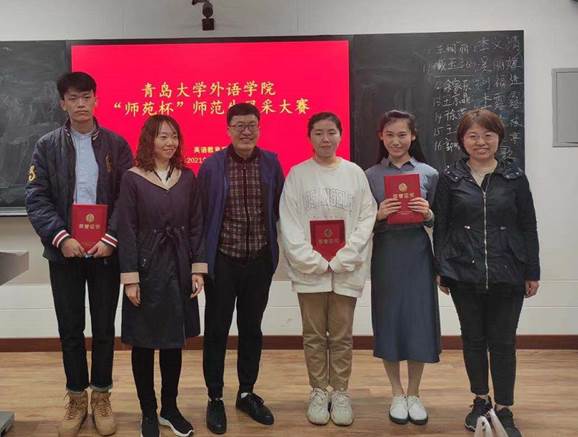 娄永强、布占廷、黄芳、王进福、宋蕾、徐平老师担任校内评审专家。赛后,三位英语教研员老师针对同学们的教学设计、教学实施提出了具体的改进建议,并祝贺青大外院英语教育系学子在第九届山东省师范类高校学生从业技能大赛中再创佳绩,展现新时代英语师范生积极向上的教学面貌和过硬的英语教学技能。