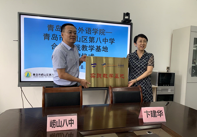 实践教学基地” 揭牌仪式。院长卞建华、副院长布占廷、娄永强,英语教育系主任黄芳、副主任王进福、宋蕾、吕凯良、贾伟,党政办主任华登峰、崂山教体局总督学张清海、崂山区教体局副局长孙咏梅、崂山八中校长肖世强、副校长江昊世和八中外语组骨干教师参加仪式。双方进行了会谈并签署合作协议,仪式由张清海主持。