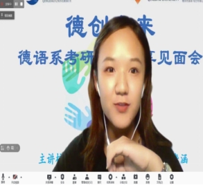 德语系通过腾讯会议举行“德创未来”线上考研经验分享交流会。此次交流会邀请4位2021届德语专业优秀毕业生为同学们介绍自己的考研心得,她们分别是考取中国海洋大学企业管理专业的白丽艳学姐、考取同济大学德语语言文学专业的何晓蕾学姐、考取北京外国语大学会计专业的刘洪雪学姐以及考取北京第二外国语学院德语口译专业的杨晓涵学姐。交流会由德语系副主任刘沁卉老师主持, 2018级、2019级50余名在校本科生参加了交流。