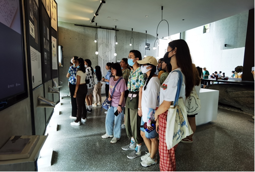 中德生态园调研参观结束后,师生乘大巴返回市区,来到青岛市档案馆。这里的二、三层展厅陈列着展现青岛城市历史与各方面发展的珍贵史料档案、实物展件、模型展件等。展柜中发黄的书页、地图和老照片,两名讲解员长达40分钟的细致讲解,将同学们带回了遥远的年代,从清朝末年青岛建制到德占胶州湾时期,从日占时期到国民政府统治时期,从青岛解放到新中国成立后青岛城市的快速发展,完成了一次充满历史沧桑感的时光之旅。同时,这也是同学们第一次近距离观看档案史料,很多展件引起了大家极大的兴趣,大家久久驻足、纷纷拍照。
