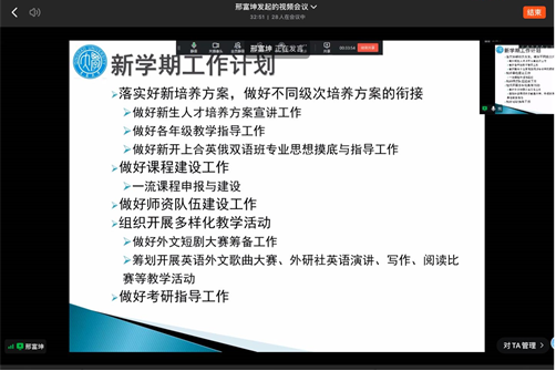 英语系召开2021年秋季学期开学工作会议,总结全系上学期工作,布置新学期教学任务,会议由邢富坤主任主持,全系教师参加。