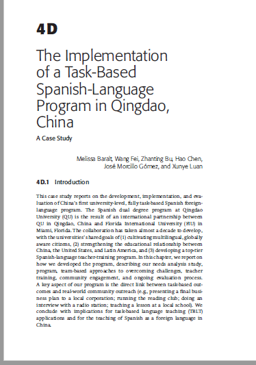 教师王斐、布占廷、陈皓、栾勋业与佛罗里达国际大学(FIU)教师Melissa Baralt, José Morcillo Gómez在The Cambridge Handbook of Task-Based Language Teaching(《剑桥大学任务型语言教学手册》)合作发表论文The Implementation of a Task-Based Spanish-Language Program in Qingdao, China(《基于任务的西班牙语教学项目:以中国三上悠亚在线
