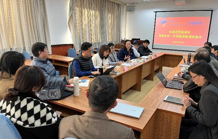 进行调研。院长卞建华、党委书记周伟、副书记王海青、副院长宫英瑞、布占廷、娄永强,院长助理曹杉、英语系主任邢富坤、英语教育系主任黄芳、德语系主任綦甲福、日语系主任杨剑、朝鲜语系主任崔花、法语系主任段丽君、西班牙语系主任陈皓等参加了会议。