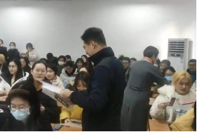 2018级学生代表李心怡、侯斯麒以诗朗诵《星辰大海》为同学们加油鼓劲、表达祝福。随后,肖江南及学院老师们在现场、自习教室和宿舍楼内,为同学们送上“考研加油包”,为考研助力。