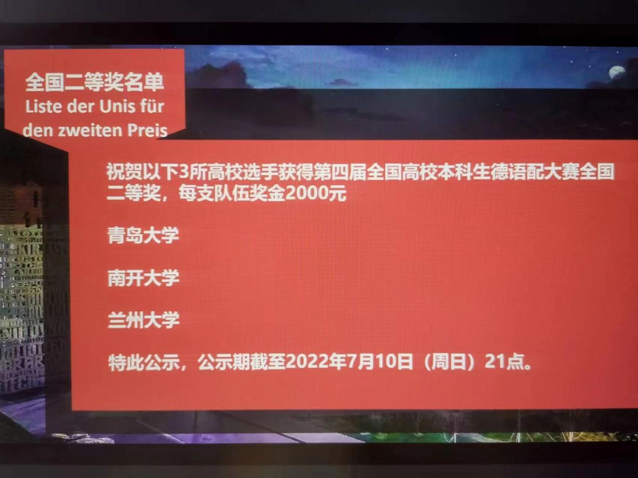 德语系2019级六名本科同学顾佳靓(队长)、李静、唐应萍、薛琪、张佳诺、张宇彤,在刘惠宇老师指导下,凭借三次参赛的丰厚经验和不断打磨提升的配音水平,在高手云集的全国大赛中一路向前,最终荣获全国二等奖的佳绩。