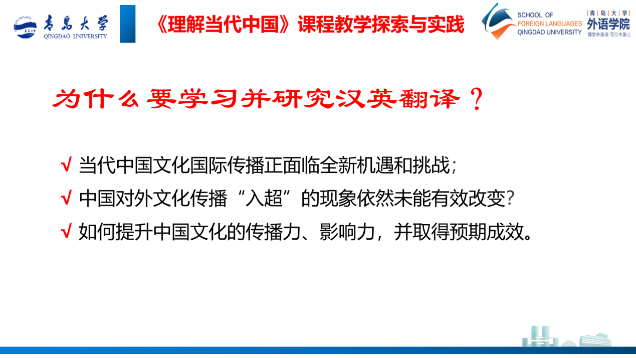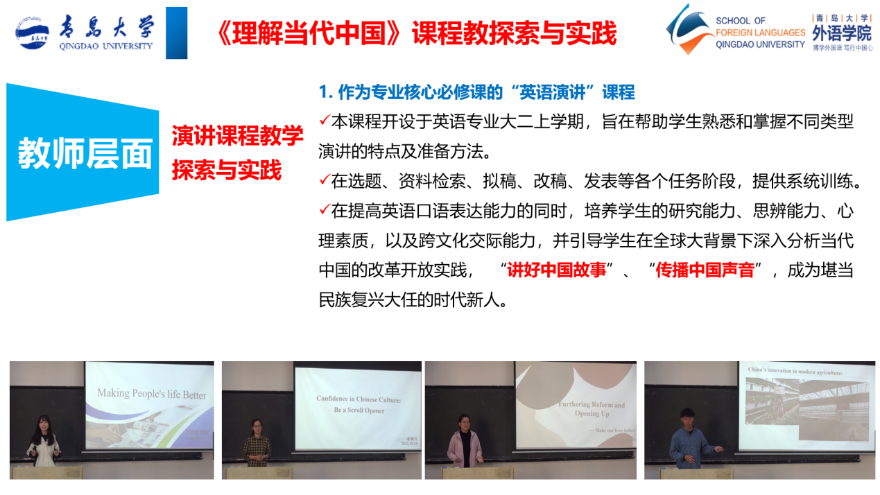 专业课程思政融合的最新教学成果。在今后的外语教学实践中,学院将继续依托《理解当代中国》系列教材,进一步加强学生的资料检索、翻译实践及语言生动呈现能力,同时将利用本校资源,联络国际留学生,做目标读者和听众分析问卷,邀请目标受众代表参加现场课堂教学、阅读翻译文本、倾听英语演讲,进行反馈互动,以教促研,以研促教,促学。