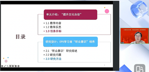 讲座的第二部分,孙旻老师分享了基于该单元教学的“EPS学习者听众意识培养”研究设计,为演讲教师提供了教研相结合的新思路。