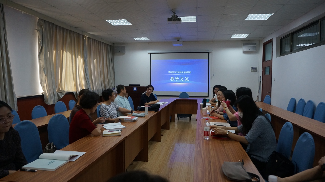 英语系2022年秋季学期期初教研交流成功举行。会议由英语系副主任王薇老师主持,英语系教师就新学期开学以来教学过程中遇到的问题进行了热烈讨论,共同探索教学方法与实施路径。