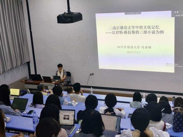 德语系李昌珂教授主持,德语系主任綦甲福教授、程茜老师、退休的陈骏飞老师以及英语系王薇老师与德语系40余名同学线下参加了讲座,另有东校区的同学、在国外交换学习的研究生同学和在各地实习的毕业班同学60余人线上聆听了讲座。