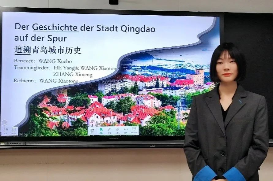我系团队参赛项目为“Der Geschichte der Stadt Qingdao auf der Spur”(追溯青岛城市历史),团队从德占青岛时期史料出发,研究德国文化与青岛文化融合过程中语言的碰撞与演变,从“青岛”“中山路”“啤酒”3个看似平常的名称出发挖掘语言背后的城市发展史,讲述历史背后的故事。在比赛中,三上悠亚在线
