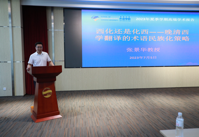 讲座伊始,张景华教授引经据典,点明鸦片战争后中国开启了西学翻译高潮,术语翻译始终是“译事之中坚”,学术界十分重视术语翻译的精确性,并据此进一步提出本次讲座的主题:术语翻译的精确性固然重要,但其可接受性就可以忽视吗?