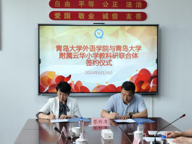 附属云华小学调研时,云华小学校长刘学友、副校长李守业、挂职教师英语教育系副主任吕凯良老师和青岛中仁集团董事长张述仁带领外院一行参观了学校以“两楼两苑一基地”为特色的校园文化。座谈交流时,刘校长对吕凯良老师在校园文化建设和学科发展方面的工作给与高度认可,双方就教育教学、人才培养、师资队伍建设等方面进行了深入交流,卞建华和刘学友签订了建设教科研联合体合作协议书,周伟和刘学友共同为“大学生实习基地”揭牌。