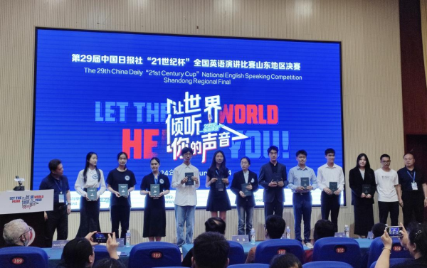 比赛中,来自山东地区各高校的38名选手依次登场,同台竞技。定题演讲的主题为‘The Revival of Traditional Culture’。比赛分为已备演讲、即席演讲和现场问答三个环节。比赛现场高手云集、竞争激烈。两位同学顶住了压力,充分发挥,以充满激情的演讲、逻辑清晰的表述和灵活机智的回答赢得了评委的肯定,成功晋级。