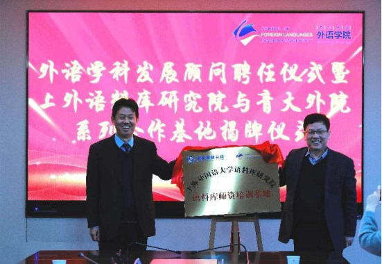 胡开宝分别与钟永光、李建波、马泽刚、周伟为上外语料库研究院和青大外院系列合作基地揭牌。