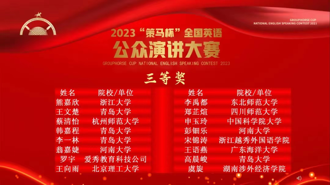 2024年3月17日,由英国大使馆文化教育处/英国文化教育协会官方支持、英国皇家特许语言家学会和北京策马翻译有限公司(联合国官方翻译服务供应商)联合主办的 2023年“策马杯”全国英语公众演讲大赛全国总决赛在线举行。经过前期初赛和大区赛角逐,三上悠亚在线