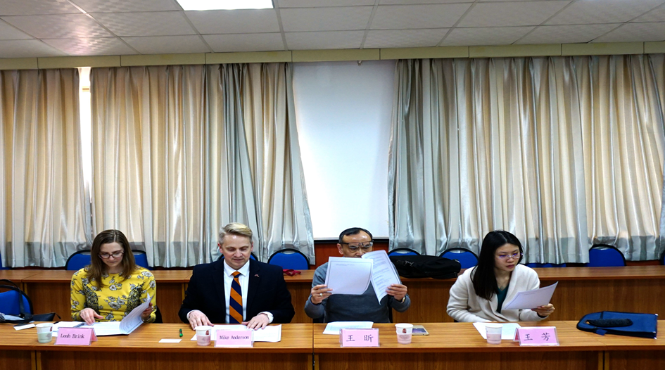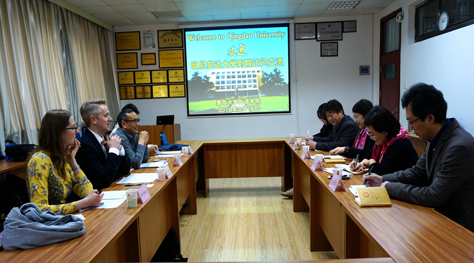 3月19日上午,美国明尼苏达大学英语语言中心主任Mike Anderson、短期访学项目主任Leah Brink和盈富林国际集团董事长王昕教授一行三人到院访问交流。院长卞建华、普通英语系主任陈黎、师范英语系主任娄永强、中外英语系副主任王进福在博文楼312会议室与来访客人进行了座谈交流。