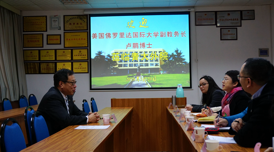 3月20日下午,美国佛罗里达国际大学(FIU)副教务长卢鹏博士到院进行访问交流。院长卞建华、副院长宫英瑞出席在博文楼312会议室举行的座谈会,西班牙语系主任陈皓、副主任栾勋业、2018届毕业生辅导员寇磊、外事服务秘书鞠阿楠、党政办主任扈炳良参加交流。
