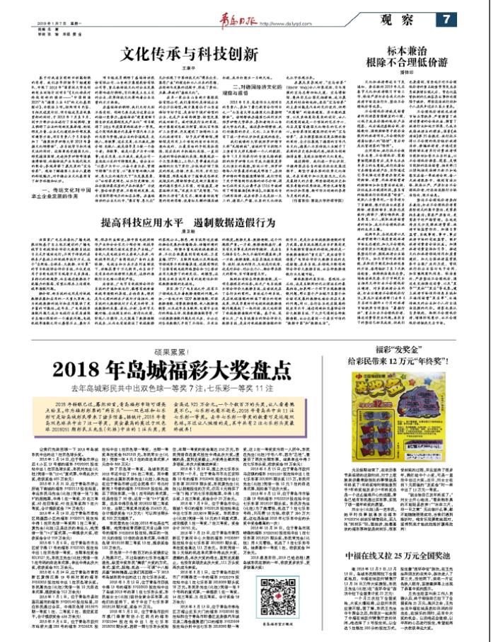 德语系2016级本科生王康平撰写的《文化传承与科技创新》调研文章,在2019年1月7日《青岛日报》“观察”版显著位置发表。