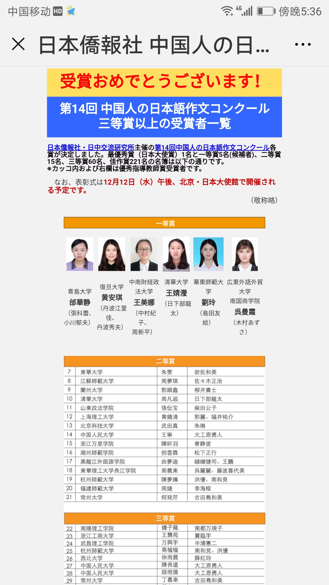 该奖由日本桥报社・日中交流研究所于2005年开始每年举办一次,面向中国日语学习者(无日本留学经历者),截至2018年已经举办了14届。该作文比赛旨在促进中日两国相互理解和文化交流。今年从5月8日至5月31日在中国28个省235所高校中征集了4288篇作文,从中选出“最优秀奖・日本大使奖”1名、“一等奖”5名、“二等奖”15名、“三等奖”60名,并于12月12日在日本驻中国大使馆举办表彰大会。(日语系)