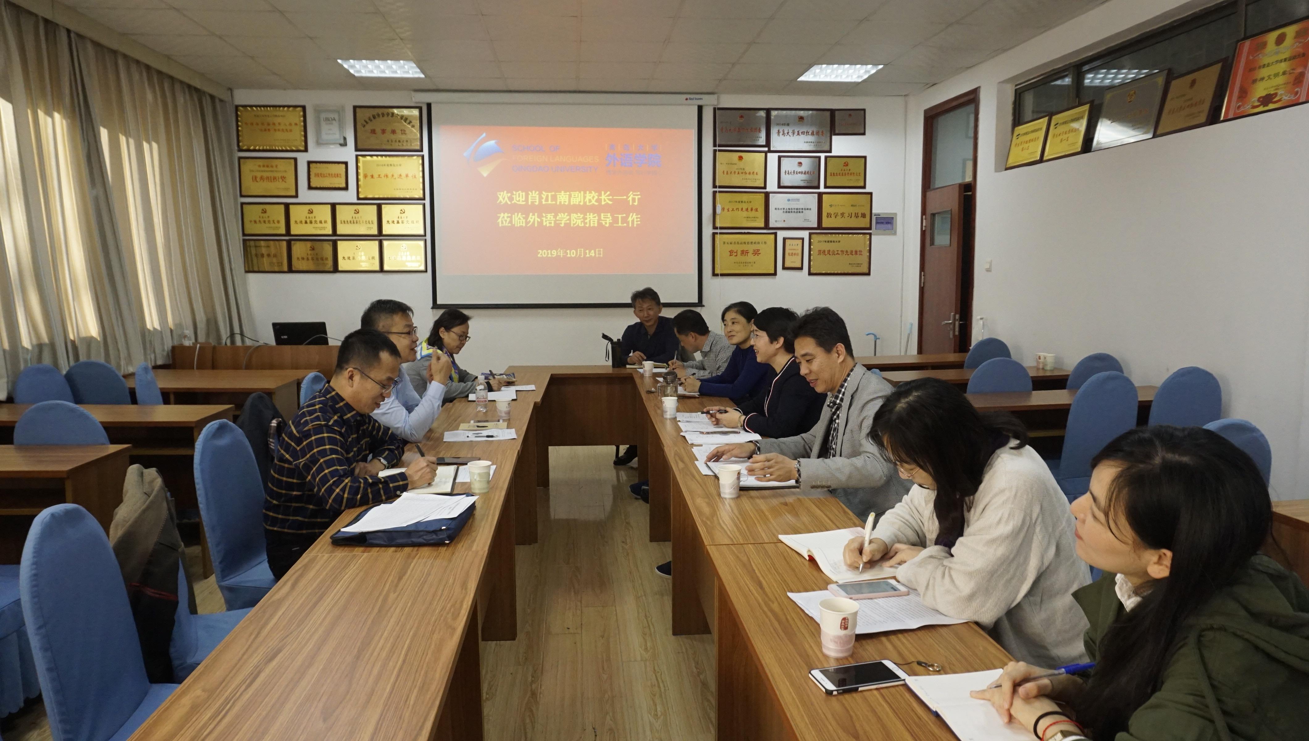 院长卞建华代表学院就人才培养、队伍建设和学科发展等方面的工作进行了汇报。卞院长谈到,近五年来,在校党委、校行政的正确领导下,在校职能部门的大力支持下,在全院教职员工的共同努力下,学院在学科建设、人才培养、科学研究、队伍建设等方面取得了显著成绩。但与高水平兄弟院校相比,与博士学位点申报门槛条件相比,学院仍然存在一些不足,特别是队伍建设方面依然存在短板,迫切需要引进翻译学、外国文学、跨文化交际与比较文学和语言学方向领军人才,希望学校今后在人才引进工作中充分考虑外语学科的特点给予更多支持。