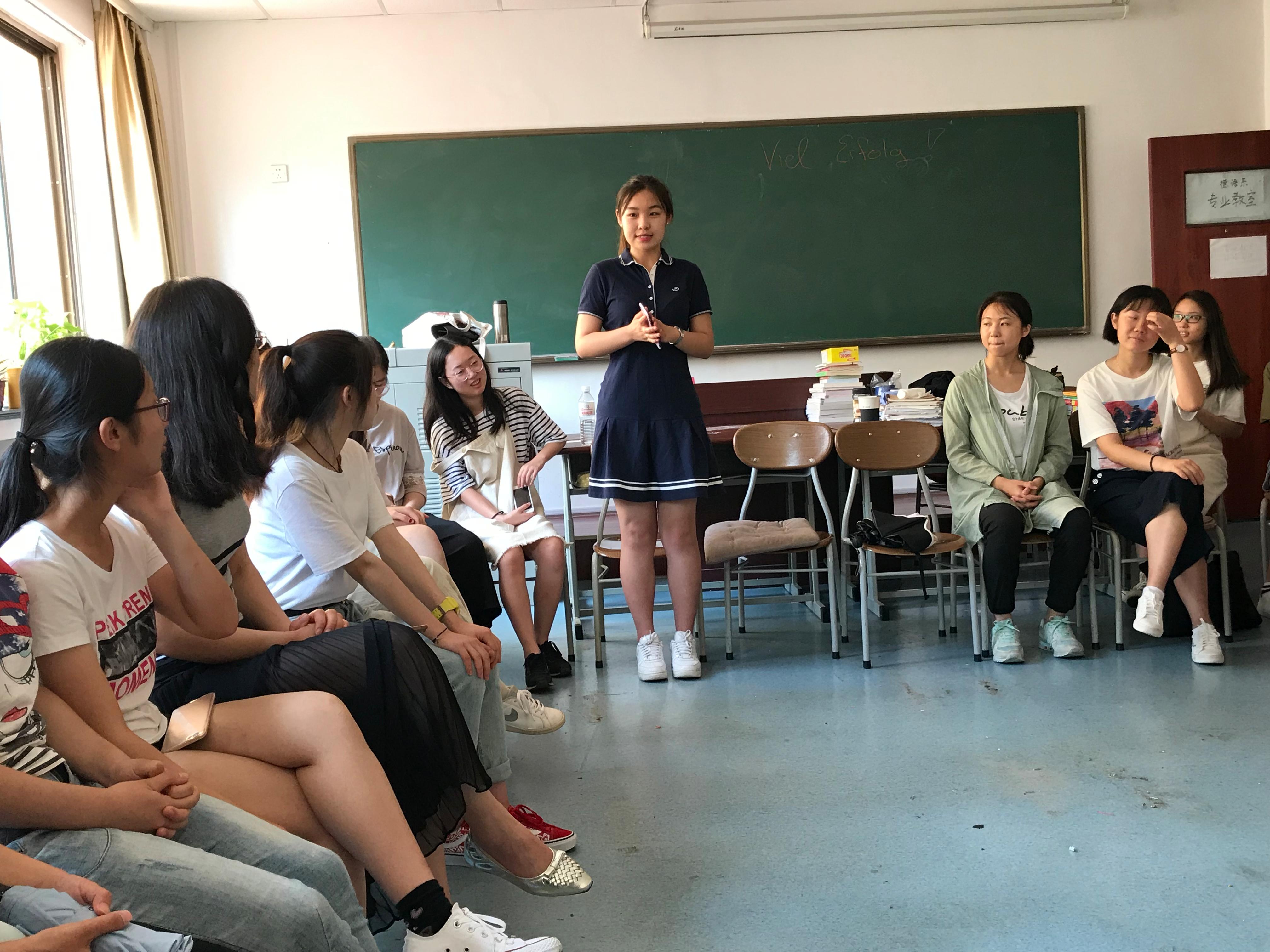 德语系17级同学王玥介绍了德语专业的课程安排情况,厉烨简单描述了学生日常的校园生活,曹玥介绍了大学生艺术团等其他形式多样的学生社团活动,以及各种丰富的学术类竞赛和社会调研比赛,张寒着重介绍了三上悠亚在线