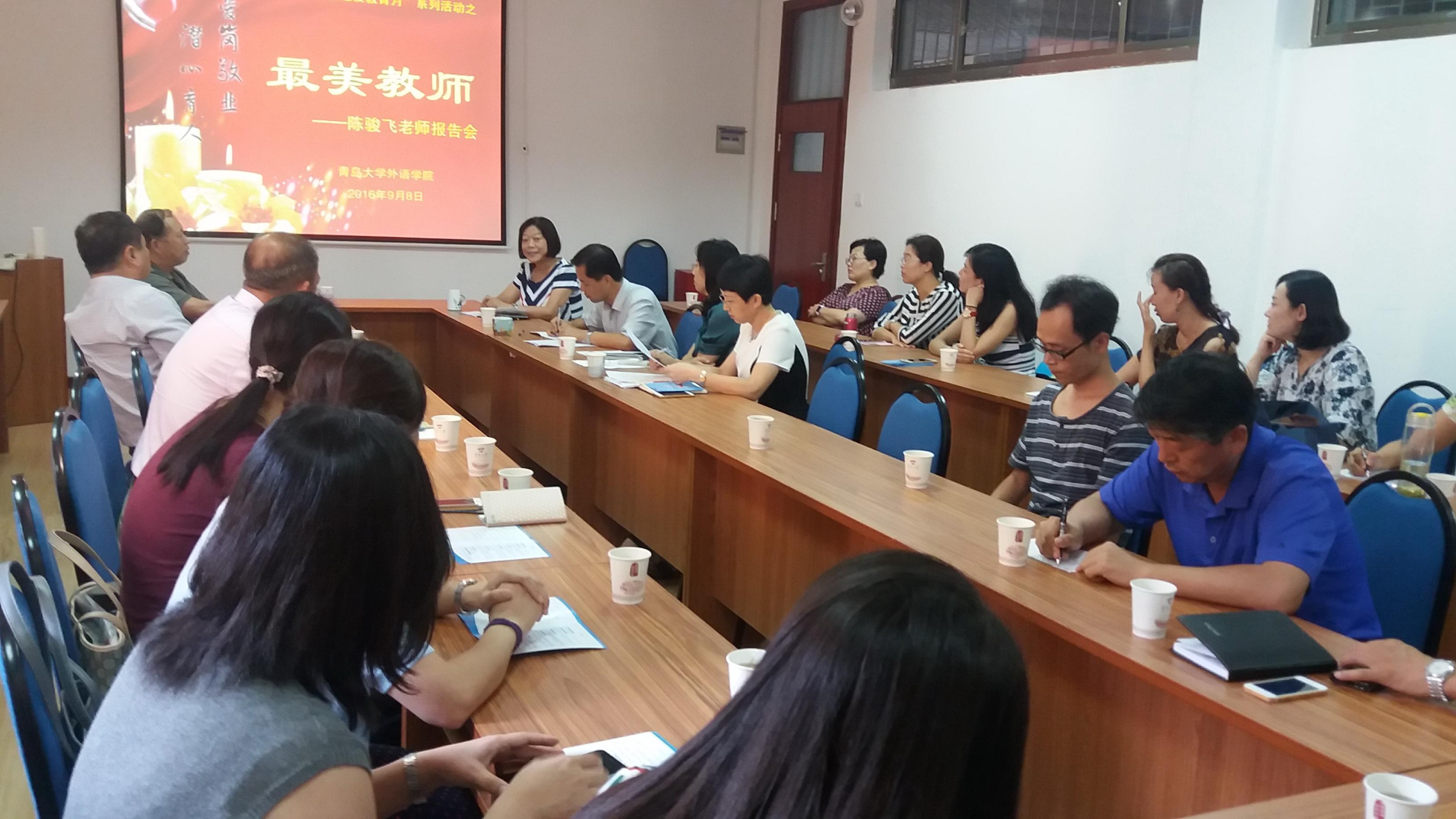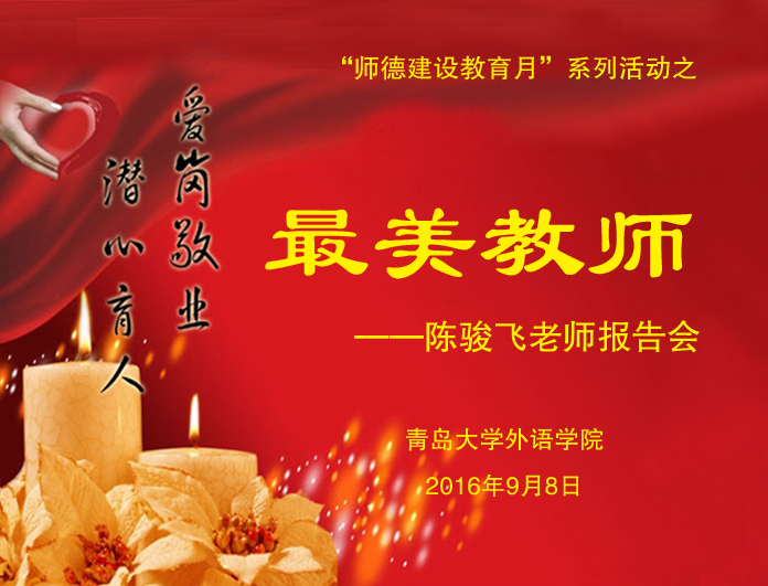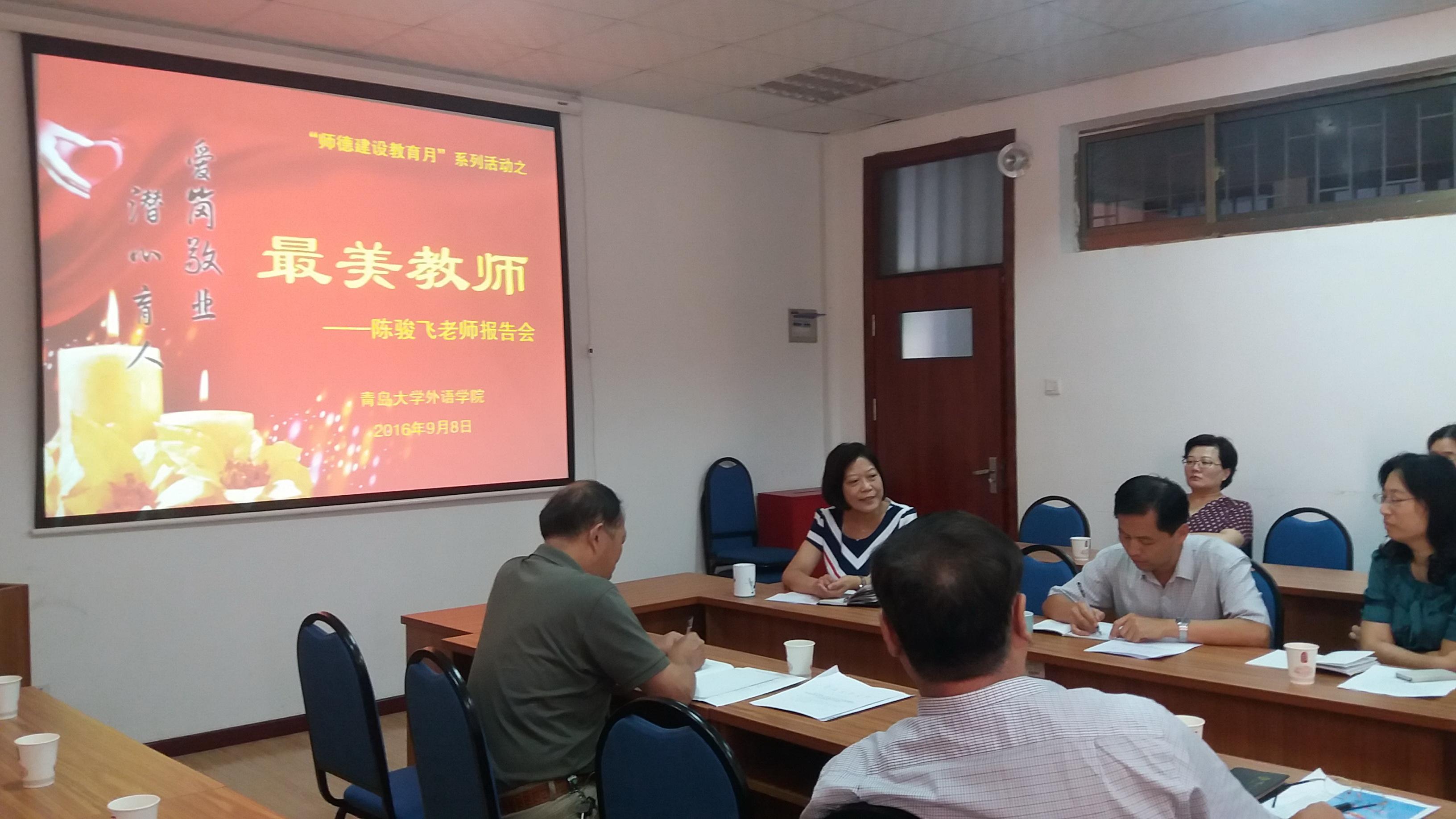 报告会上,陈骏飞用平实的话语讲述了多年工作的心得和感悟,更是对青年教师提出了期望和勉励。她说,对待工作和生活,要有谦虚心、感恩心和责任心。要学会相互学习,常怀感恩和勇于担当;在生活中要热爱生活,以爱唤醒良知,以正能量感召身边的人,这样才能每天充满快乐,才能做到不为名利去斤斤计较。她希望青年教师 “上好每一堂课,改好每一本作业,爱护每一位学生”,遇到事情能做到“平常心”,当下事慢慢来,急不得。