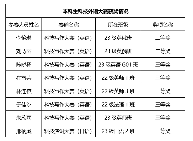学生在大赛中努力拼搏,斩获多个奖项,共获得二等奖6项,三等奖10项。其中,本科生获奖8项,李怡琳、刘诗雨在科技写作大赛(英语)获二等奖,陈晓杨、崔雪芸、林连祺、于佳汐、朱欣雨获三等奖;邢柄柔在科技演讲大赛(日语)中获得三等奖。研究生获奖8项,其中陈子轩获科技翻译大赛(英译中)二等奖,孙维奇获科技翻译大赛(中译英)二等奖,霍研君获科技翻译大赛(朝译中)二等奖,石乙淙获科技翻译大赛(朝译中)三等奖,徐千惠获科技写作大赛(英语)二等奖,高逸玲、王旭、张梦雨获三等奖。