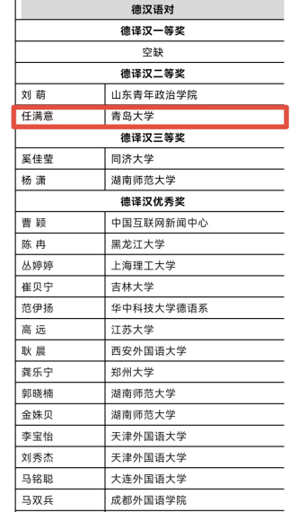 2023级德语笔译专业任满意同学荣获德译汉组二等奖,指导老师为綦甲福教授。本次比赛,德译汉方向共评出获奖者28名,其中一等奖空缺、二等奖2名、三等奖2名、优秀奖24名,颁奖典礼拟于今年年底举行。