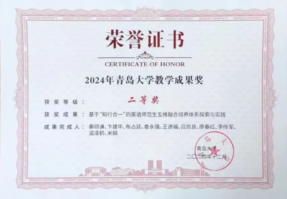 教学成果奖一等奖、二等奖,1人获评“山东省高等学校教学名师”,首部数字教材《英语文学导论》出版上架。教学比赛再创佳绩,4人次在省级、校级教师教学比赛中获奖。2024届本科毕业生国内外深造率达41%,毕业生就业率达89%,英语专业2024届英语(语言大数据)创新实验班毕业生继续深造率达71.4%,人才培养成效显著。本科生183人次获得校级以上竞赛奖励,研究生发表高水平论文7篇,竞赛获奖56人次。