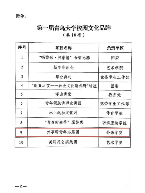 15年,一群人,9800次出征,4万小时志愿服务总时长,100余封社会各界感谢信也见证了一个普通的院级组织,成长为全国学雷锋先进典型“四个一百”全国最佳志愿服务组织,获得20余家主流媒体报道与社会广泛关注,事迹在《山东新闻联播》节目中被专题报道。如今的外事帮已经成长为一个“支部建设有特色、专业教育有平台、对外传播有声音”的全国高校知名外事志愿服务品牌。