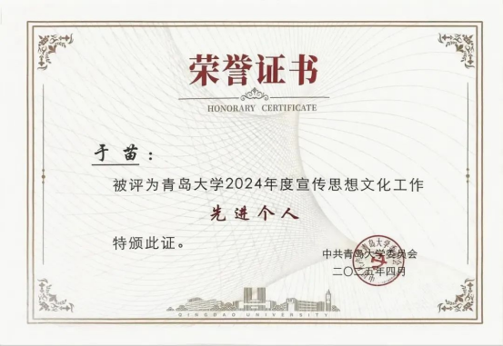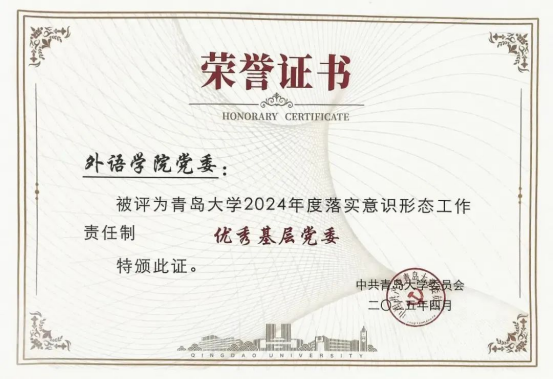 获得“2024年度宣传思想文化工作先进集体”、“2024年度落实思想意识形态工作责任制优秀基层党委”、“2024年度思想宣传文化工作普法先进单位”荣誉称号,外事帮青年志愿团荣获“第一届校园文化品牌”,外文短剧大赛荣获“第一届校园文化精品立项”共5项集体荣誉以及3项先进个人荣誉。