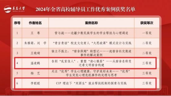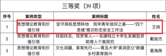 辅导员温凌鹤、李聪聪荣获辅导员工作优秀案例三等奖,温凌鹤凭借《告别“带刺玫瑰”,争做“心灵补手”——一场防范语言暴力的心理主题班会》获评山东省辅导员主题班会优秀教案个人项目。