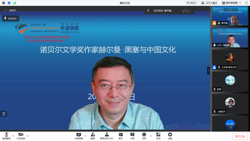 德语系主任綦甲福教授主持,校内外师生530余人通过腾讯会议聆听了报告。