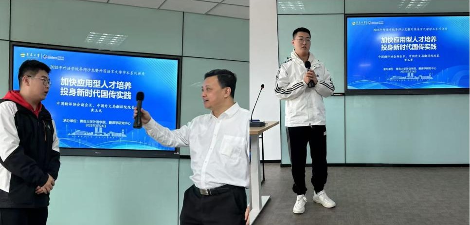 讲座中,黄玉龙院长结合自己曾在多家国家级媒体及驻外机构任职的经历,生动地阐析了国际传播的必要性和重要性,并从他提出的“静态国际传播”和“动态国际传播”两个维度,为中华文化海外传播、构建中华文明的国际话语体系指出了可行性路径。黄玉龙强调,当前正处于世界百年未有之大变局,外语学科要聚焦建设教育强国目标,努力培养高素质应用型外语人才队伍,为构建更有效力的国际传播体系作出贡献。外语人要深入研究中外局势和国内趋势,了解对象国文化与受众,助力中国文化“走出去”,这也是新时代赋予的重要使命。最后,黄玉龙就学生提出的如何在人工智能时代提升翻译水平等问题,与现场师生进行了互动讨论。讲座后,卞建华院长和学生代表分别作了学习交流体会发言。