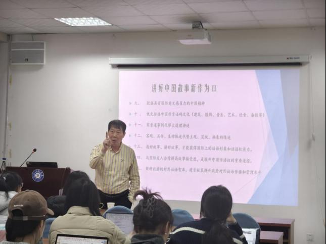 讲座伊始,谢旭升教授从霍尔姆斯对翻译学科的经典划分切入,并结合自己长期从事跨文化交流、媒体翻译与政治话语传播的研究实践,指出翻译研究由“译学理论”与“译术应用”共同构成,译学统摄译术,而译术践行译学。在讲述过程中,谢教授多次结合自身亲历的翻译案例,语言诙谐、生动,现场不时响起笑声,使严肃的理论问题变得直观、鲜活。他围绕“讲好中国故事”这一核心主题展开,梳理了其PPT中从“讲好中国故事的背景、意义、战略布局、中央重要指示与专家论见,到世界话语体系中的中国故事内涵”等多个板块的内容,系统呈现了构建中国国际传播话语体系的重要路径。他强调,翻译传播中应坚持“求大同,存小异”,以“归化为主、异化为辅”的策略来实现有效的跨文化沟通,惟其如此,才能真正达到“润物细无声”的传播效果。