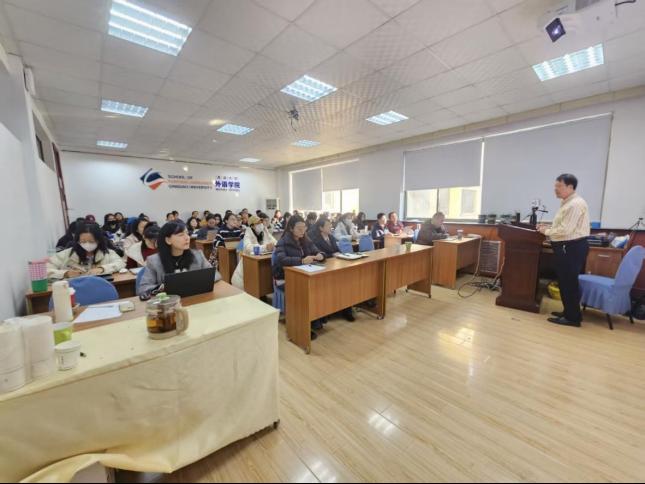 在浮山校区博文楼312会议室举办硕士研究生导师培训暨外国语言文学系列学术讲座第202讲——“译学为导、译术为要,精准翻译,讲好中国故事研究”。本次讲座由吉林外国语大学高级翻译学院谢旭升教授主讲,学院副院长曹杉主持。学院院长卞建华、德语系主任綦甲福等2025级MTI研究生及导师参加了讲座。