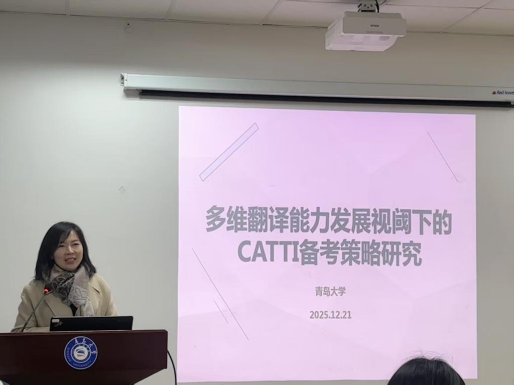 赵忠会老师是中冶东方工程技术有限公司翻译中心主任及译审,青岛大学翻译硕士研究生校外导师。12月21日上午,赵老师以“多维翻译能力发展视阈下的CATTI备考策略研究”为主题,分享了CATTI备考的各种“干货”。从前期备考、中期训练到实战作答各个环节,进行了全面的技巧分析,同时在讲座中带领同学们进行翻译案例练习,极大地带动了大家的学习热情。赵老师总结了考试常见失分点和扣分项,并针对笔译和口译专业分别进行核心考点剖析,方便同学们更高效地进行备考,提升翻译技巧。