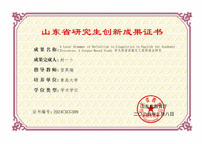 外国语言学及应用语言学宫英瑞教授指导的2022级硕士研究生赵一卜,其研究成果A Local Grammar of Definition in Linguistics in English for Academic Discourse: A Corpus-Based Study荣获山东省研究生创新成果奖。此次系三上悠亚在线