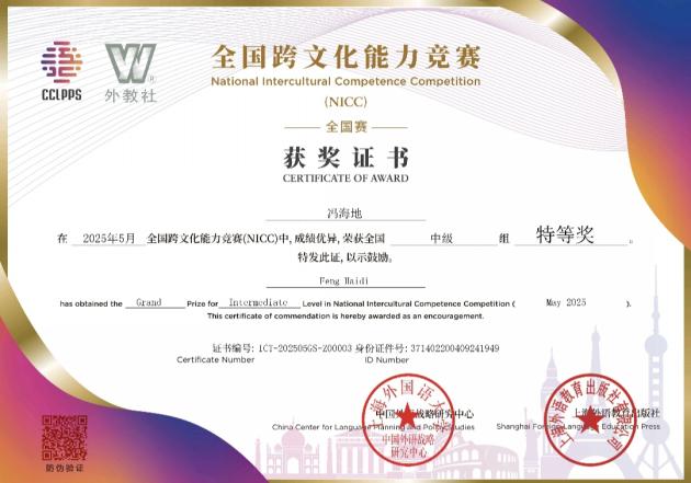 学子表现出色,23级英语(上合英俄双语创新实验班)冯海地同学以中级组全国季军的成绩获国赛特等奖,22级法语系杜青青同学获中级组国赛二等奖,22级西班牙语系赵依蕊同学获初级组国赛三等奖。