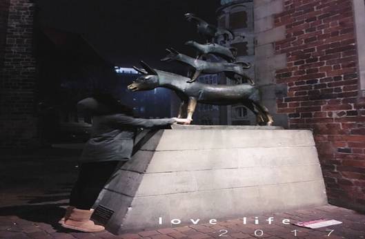 格林兄弟让不来梅这座小城充满了惊喜和活力,他们创作的举世闻名的不来梅音乐家的故事也是家喻户晓。漫步在小城中世纪的街道上,在集市广场市政厅旁的角落边会看到不来梅音乐家的铜像:鸡猫狗驴叠罗汉在一起,显示他们团结一致的顽强战斗力。每天都会有世界各地的童话粉丝来到这尊雕塑前面瞻仰他们心目中的动物乐手,铜像因为时间的流逝呈现出深绿与黑色的斑驳,只有驴的两只前蹄异常锃亮,因为游客们会用手摸摸驴子的前蹄,据说这会带来好运。我有幸在这座童话之城跨年并度过了23岁生日,有幸摸到了驴子的前蹄并许下了愿望,希望有一天能够真的实现。