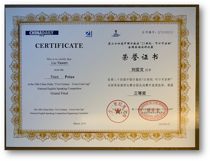 3月21-24日,第二十四届中国日报社“21世纪•可口可乐杯”全国英语演讲比赛全国总决赛在杭州举行。此次比赛由中国日报社与可口可乐大中华区联合主办,二十一世纪英语教育传媒承办,国际英语联合会(ESU)、世界英语教师协会(TESOL)、美国教育考试服务中心(ETS)、英国寄宿学校联盟、香港科技大学、澳门理工学院等学术机构协办。总决赛还邀请了习近平总书记的英文翻译、外交部翻译司培训处处长孙宁,外交部前驻外大使、外交学院和对外经济贸易大学教授任小萍,前中国日报社副总编辑黄庆、北京外国语大学高级翻译学院教授、博士生导师任文等中国英语教学界的重量级人物担任评委。