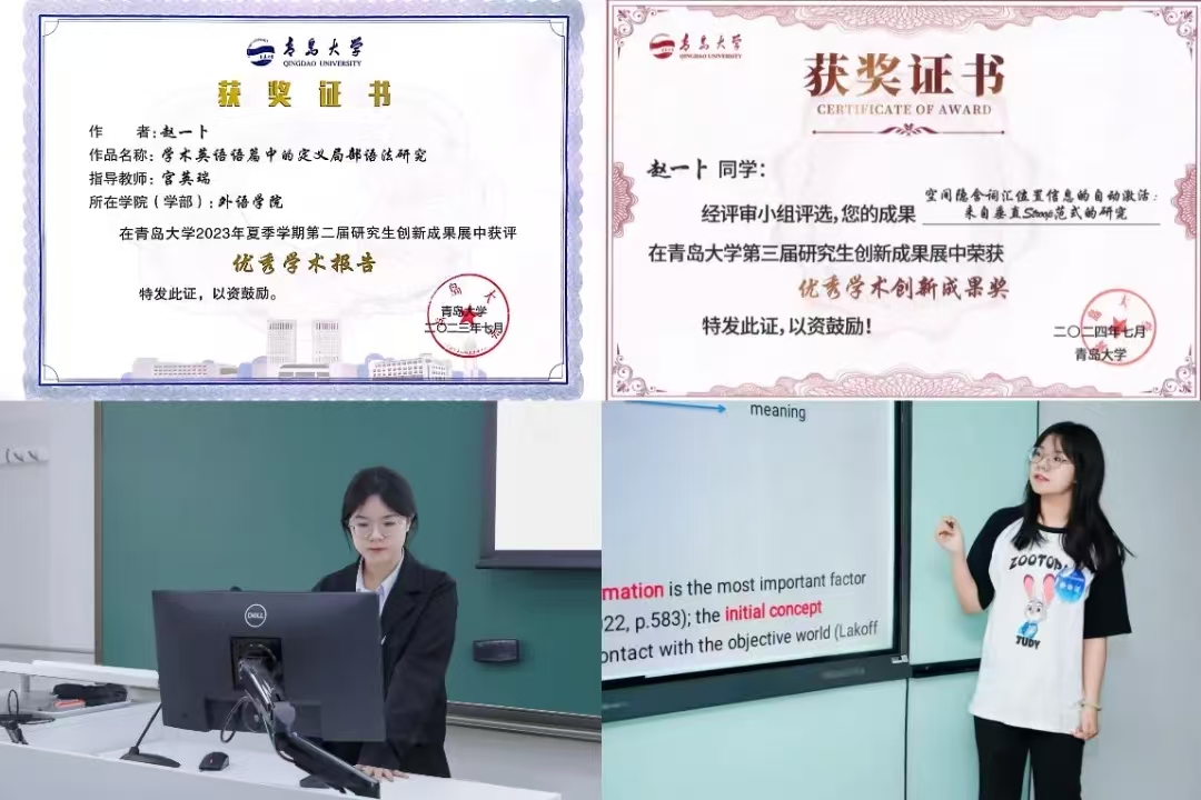 研究生创新成果展,收到了学院各专业老师的宝贵建议,并获得“优秀学术报告”和“优秀学术创新成果奖”;此外,我前往清华大学、北京师范大学参会交流,并线上参与哥伦比亚大学的认知语言学会议,来自不同学术共同体的老师们从论文结构、研究方法到投稿方向给予了我许多真诚中肯的指导。